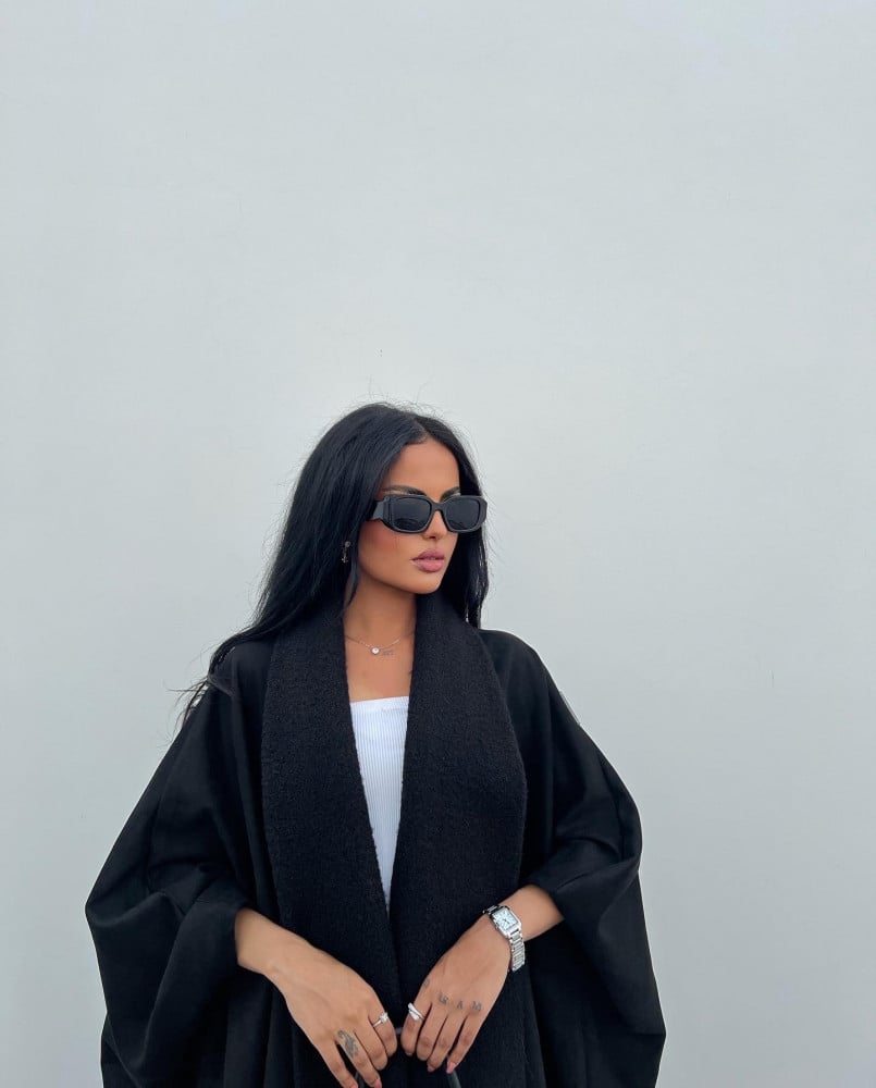 عباية بشت شتوي باللون الأسود الفاحم السادة، منسوجة من أفضل أنواع قماش الشامواه، بتصميم يجمع بين البساطة والأناقة، ببساطتها وأناقتها، مع تفاصيل إضافية من الصوف لتمنحك إطلالة مميزة، وتمنحك الدفء طول الشتاء.
