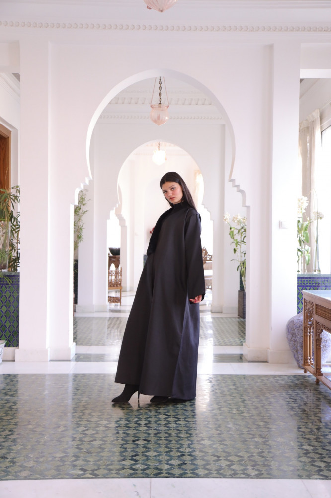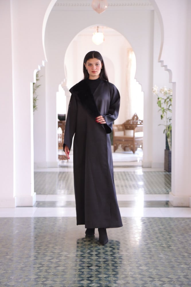 عباية مناسبات سوداء شتوية مصنوعة من قماش التفتة الإيطالي، مصممة بشكل واقف مقولب، لتمنحك إطلالة مميزة في جميع المناسبات الرسمية، كما أنها مزينة بالقليل من تدخيلات قماش الفرو على الياقة.