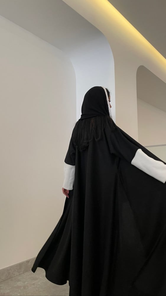عباية شتوية شامواه أسود وأبيض، أنيقة ومميزة، مصممة وفق قصة نصف كلوش الفضفاضة، لتكون مريحة وعملية، فهي خيارك الأول للجامعة أو دوام. تأتي باللون الأسود السادة، بتخيلات أبيض على الأكمام.