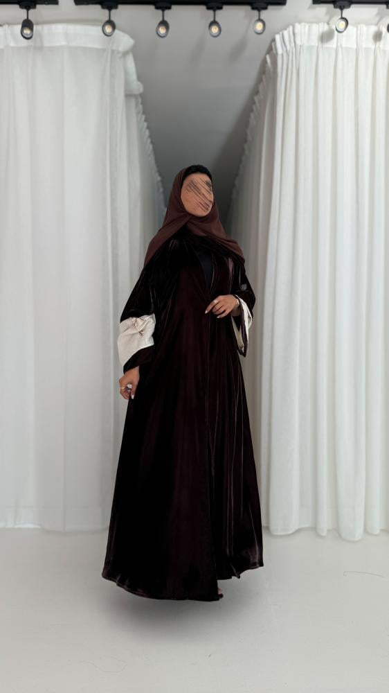 عباية قصة كلوش، أنيقة ومميزة، مصنوعة من قماش المخمل الشتوي البني لتكون عبايه شتوية بامتياز، تفاصيل المخمل المطرز على الأكمام تضيف للعباية لمسة من التفرد والعصرية، كما أنها تتميز بعدم حاجتها للكوي في كل مرة، فهي مناسبة كبديل عند السفر أو التنقلات الطويلة، لا تتجعد عند الطي، ولا تفوتكِ فكرة أنها عباية سودا، كلها باطراف مطرزه بالوان البني والخيوط ابالوان زاهية،