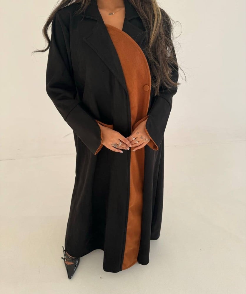 تتميز العباية بقماش الجوخ البني على الأطراف مع حجاب بنفس الموديل.