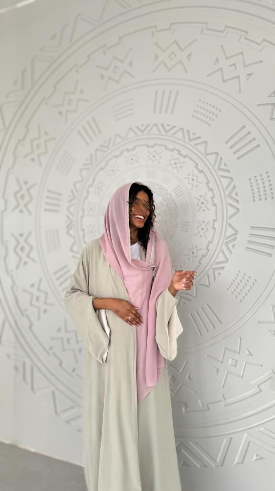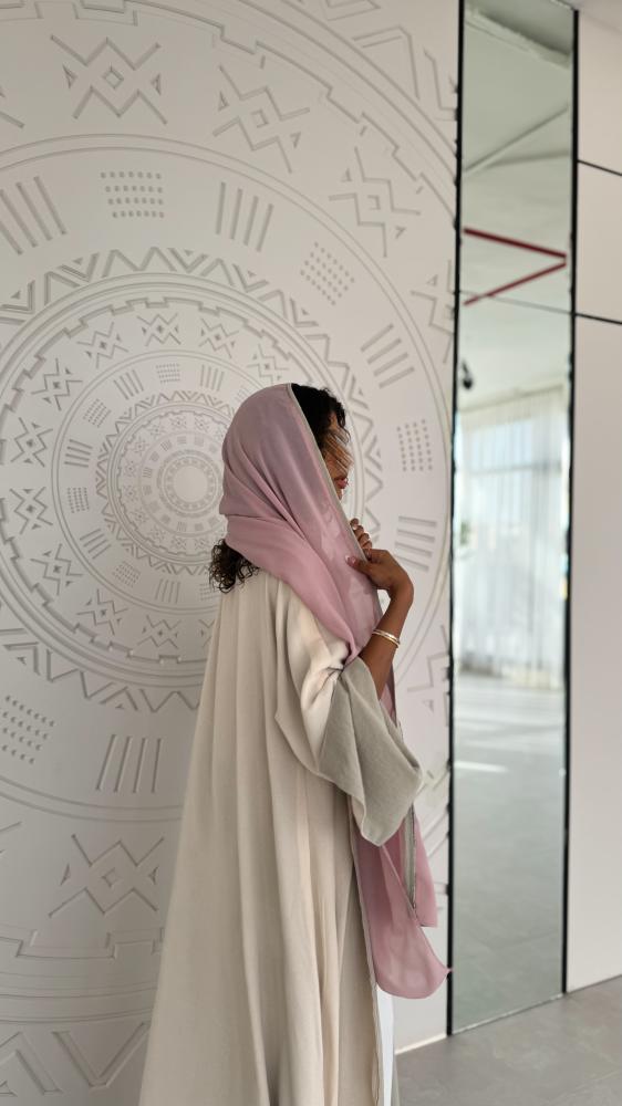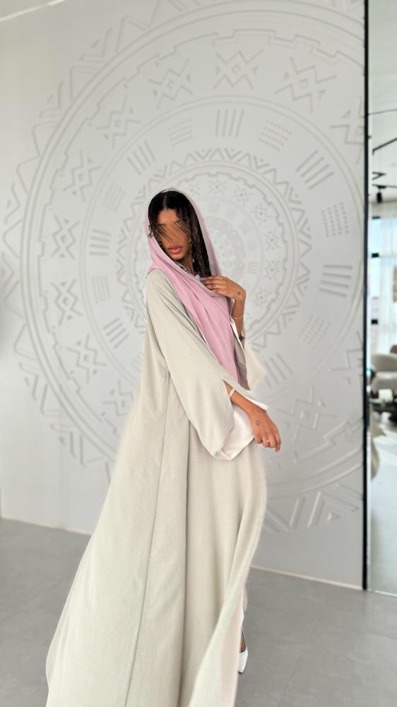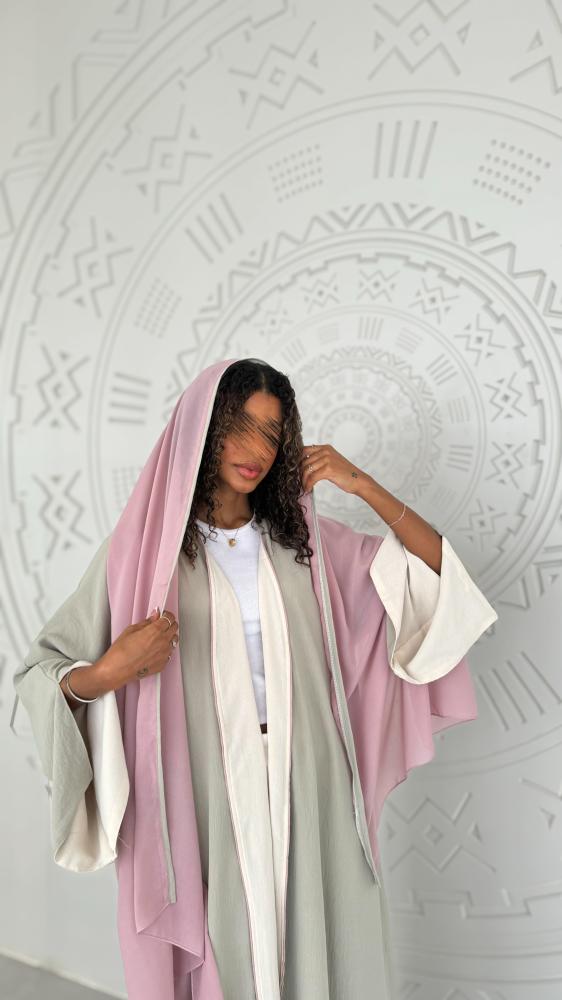 عباية كلوش أنيقة ومميزة، مصممة لتكون عباية دبل فيس، الوجه الأول لها منسوج من الينن البحريني باللون الاخضر الفاتح، أما الثاني فهو من قماش الينن البحريني بالون البيج الفاتح، بتدخيلات بالون الوردي الفاتح ، العباية واسعة ومريحة لتناسب جميع الأوقات!