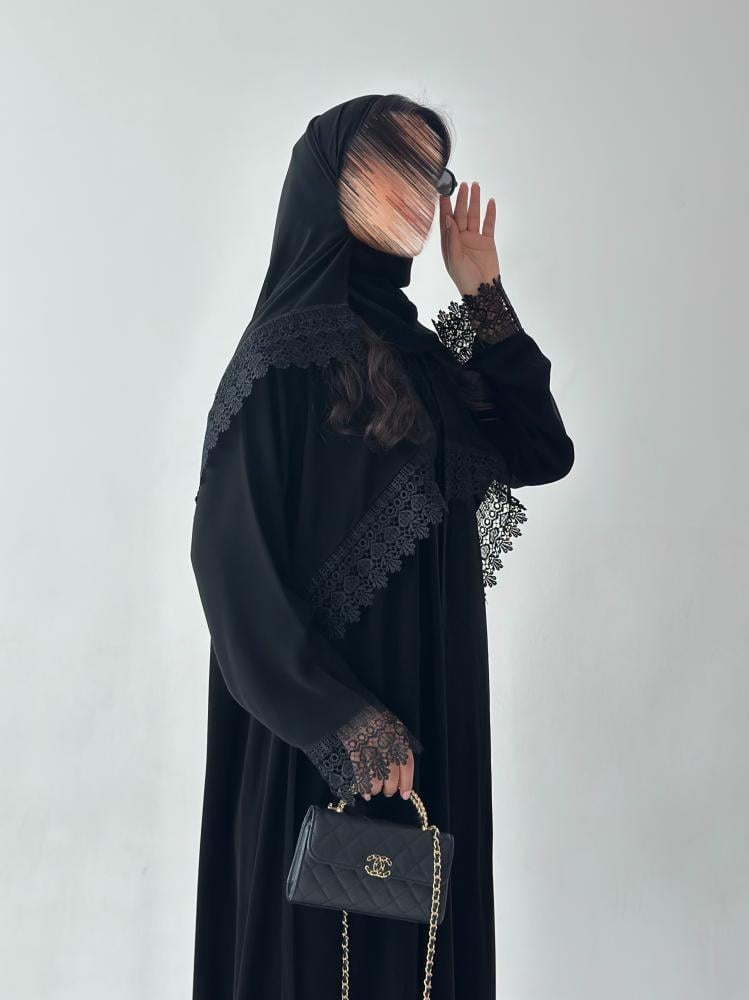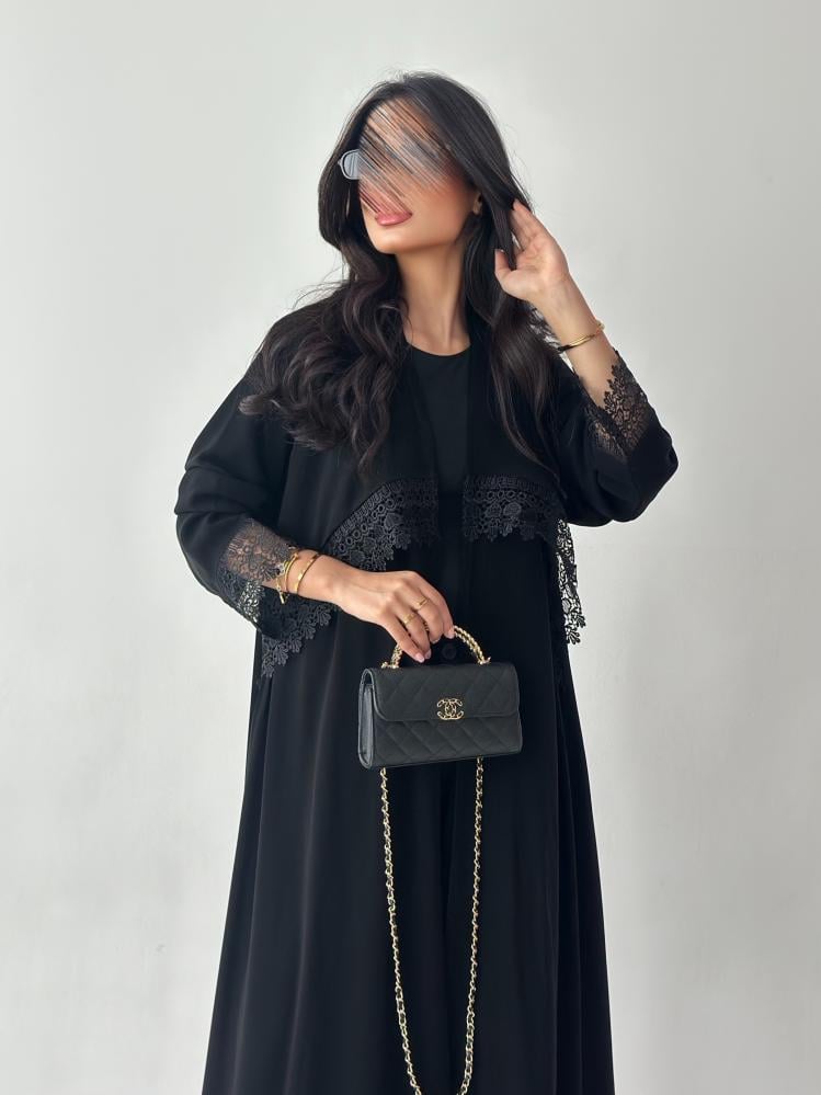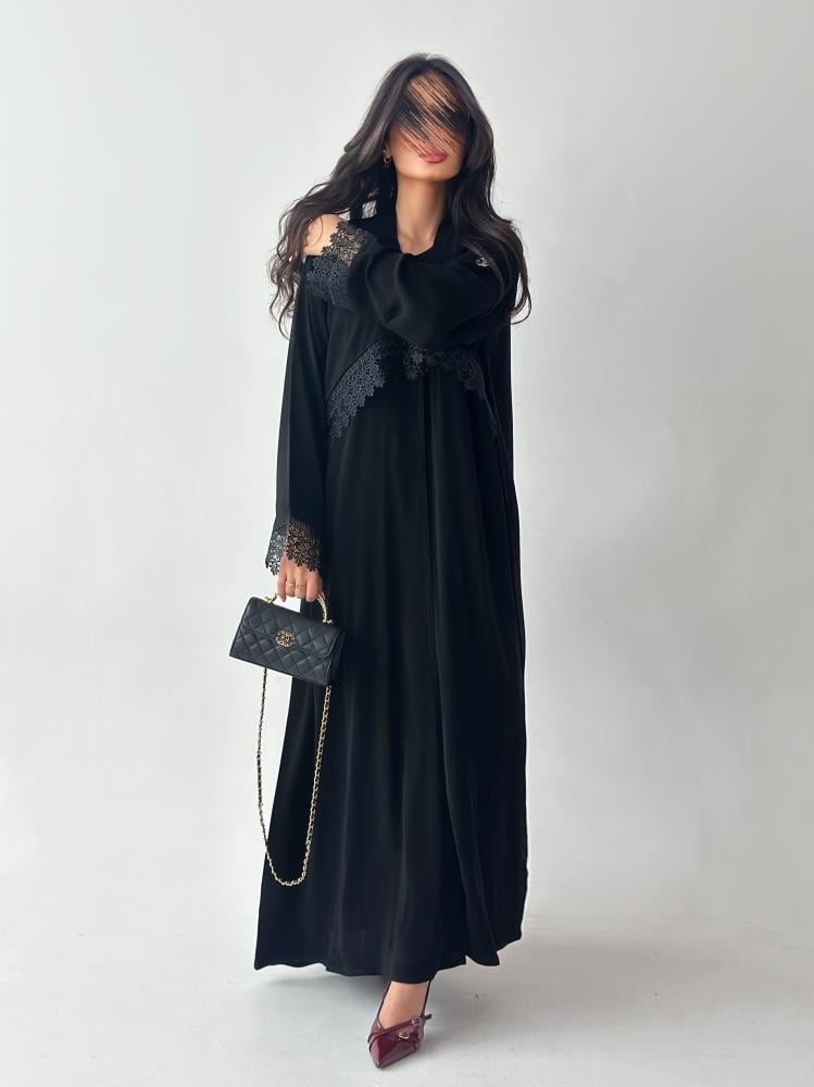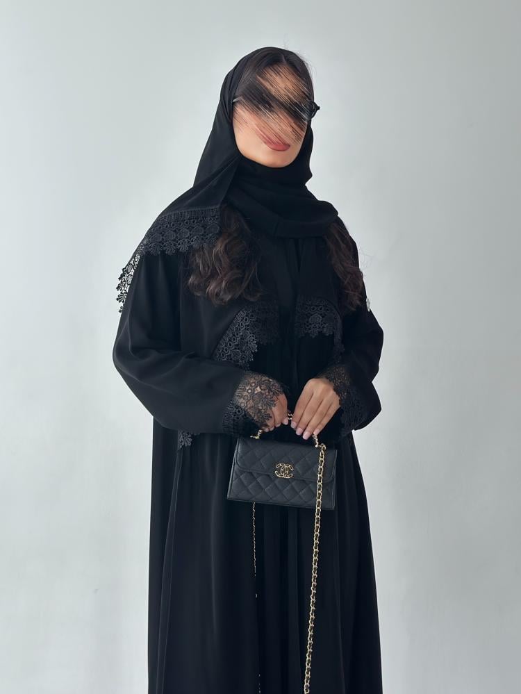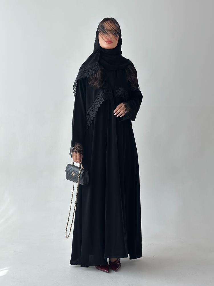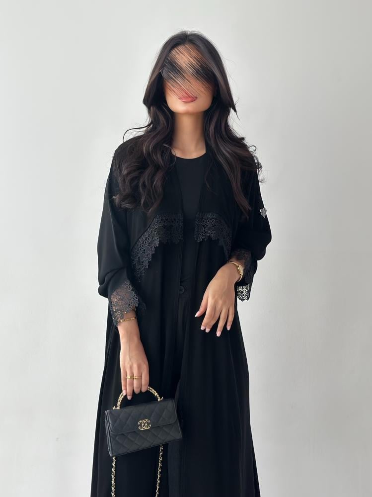 تفاصيل:اضافة دانتيل اسود على الاكمام واجزاء من العبايه
