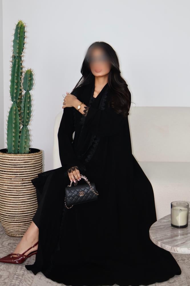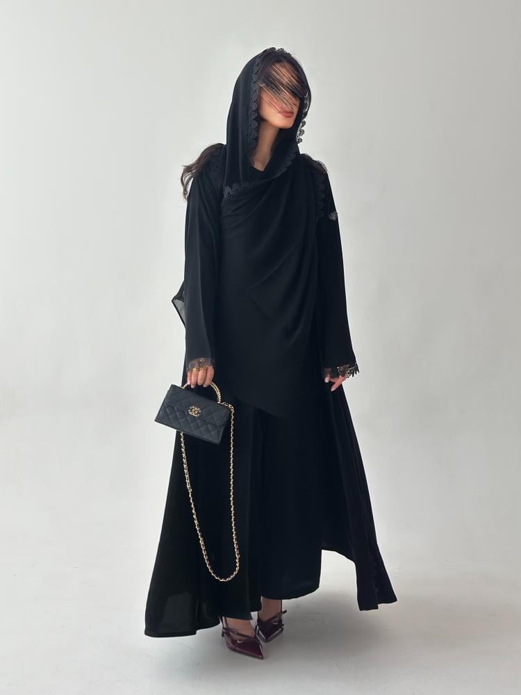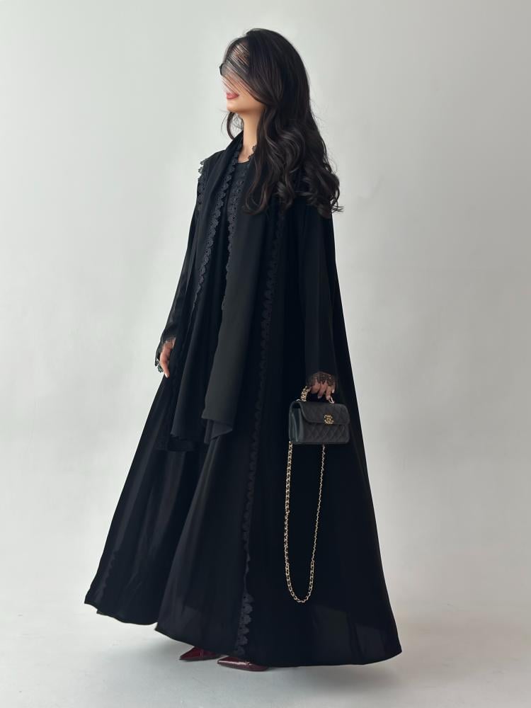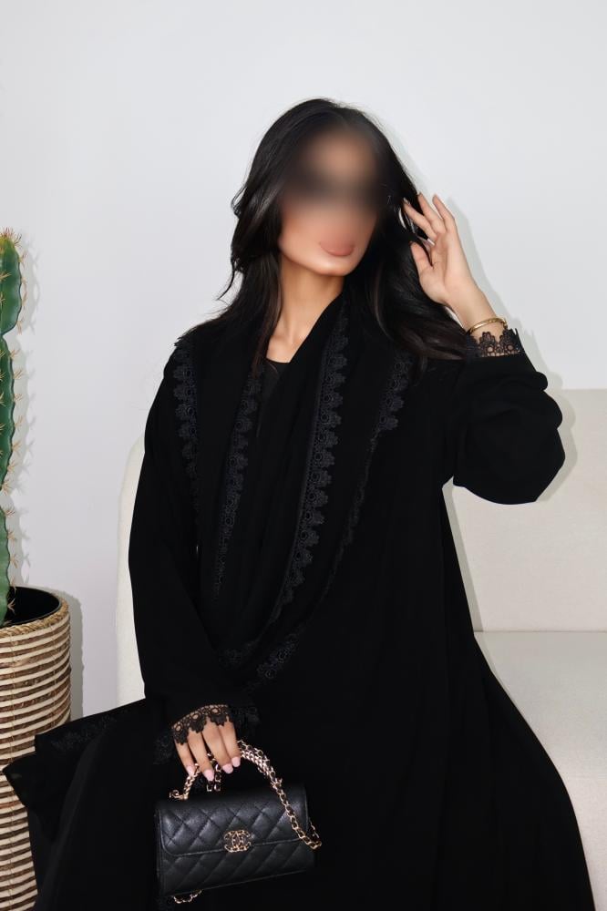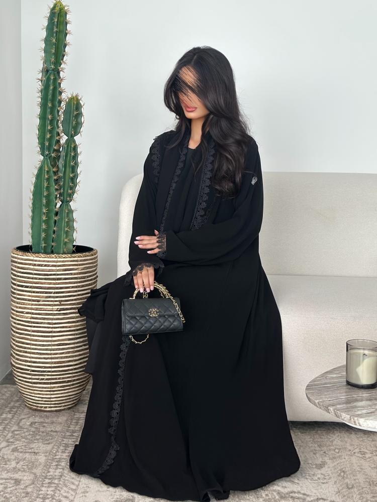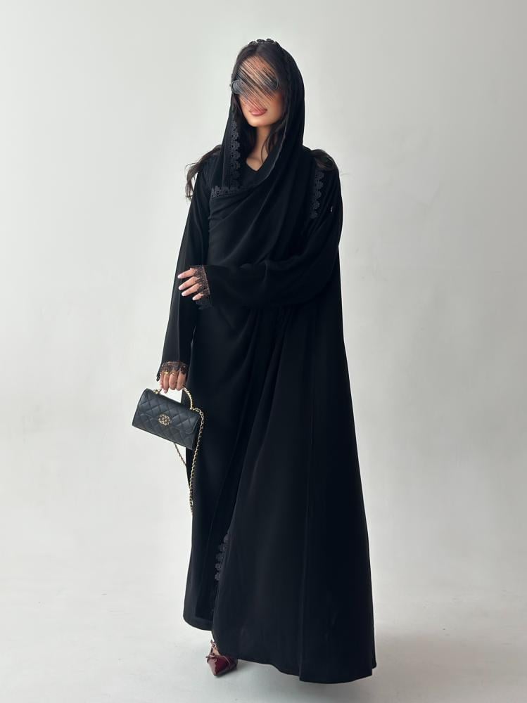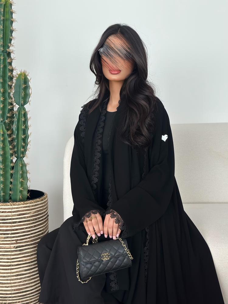 تفاصيل:اضافة دانتيل اسود على الاكمام واجزاء من العبايه